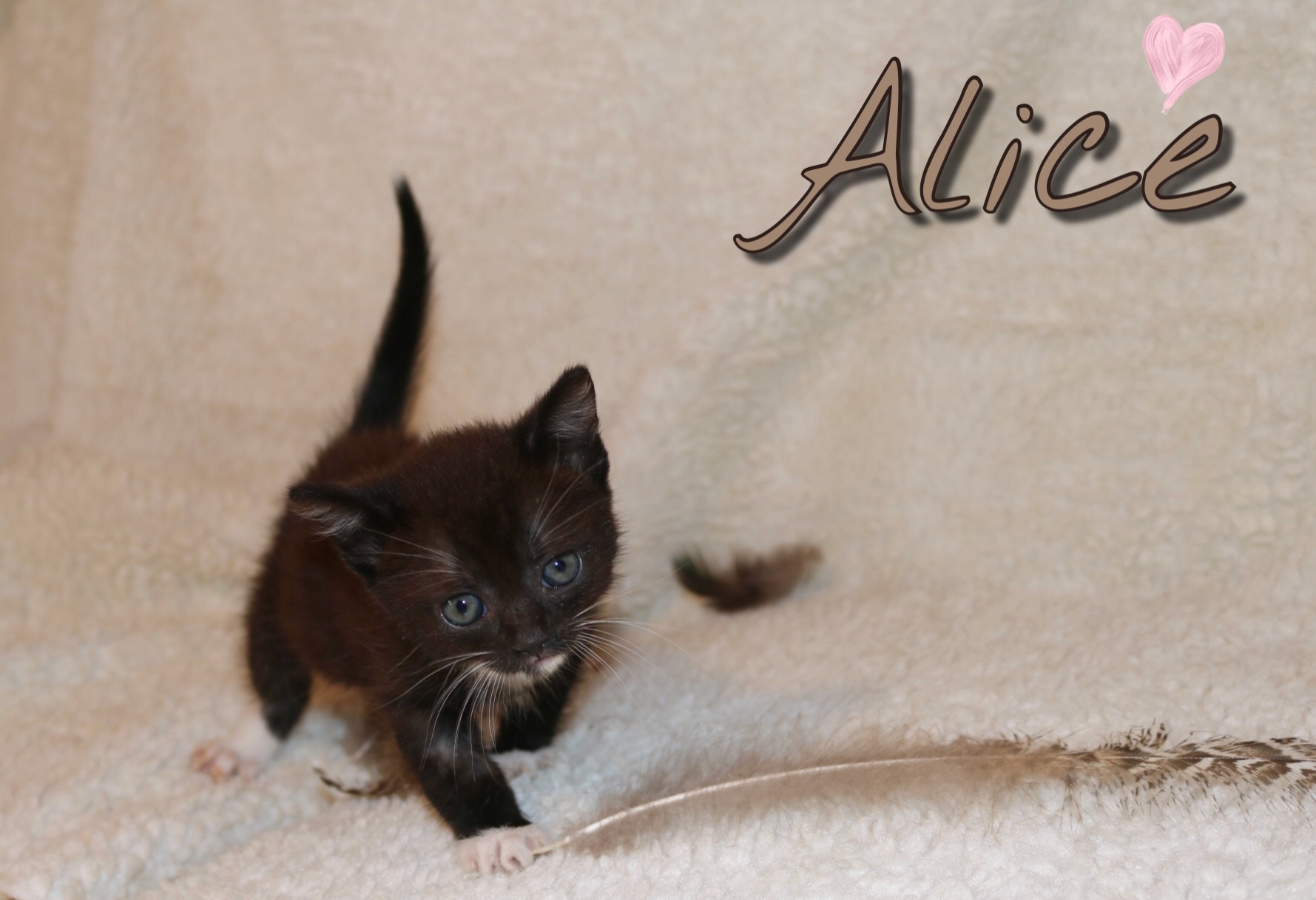 Als Sorgenkind der Kittengruppe wurde Alice mit der Flasche groß gezogen, lange war sie die Kleinste aber hat dank ihres unbeugsamen Lebenswillens gut aufgeholt. Sie hatte von Anfang an am meisten Menschenkontakt. Alice ist verkuschelt und möchte viel Zeit mit ihren Menschen verbringen. Wenn das Kittenzimmer betreten wird muss sie als erstes Hallo sagen und möchte erst mal auf den Arm genommen werden.