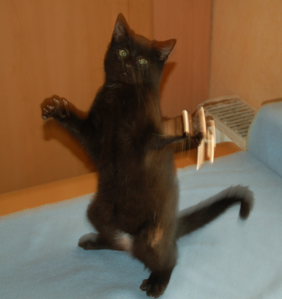 Man zücke besagte Mittelkralle, hefte ein Stück Fleisch dran und balanciere es laaangsam über die Fensterbank, auf der unser Essen steht, Richtung Wuffkatzen, die schon sabbernd und gierig mit offenem Mund unten am Boden sitzen. Plumps, Schluck- weg isses. Manchmal lass `ich sie noch zappeln. Gemein, ich weiß :) Aber sie spielen ja mit. Also.