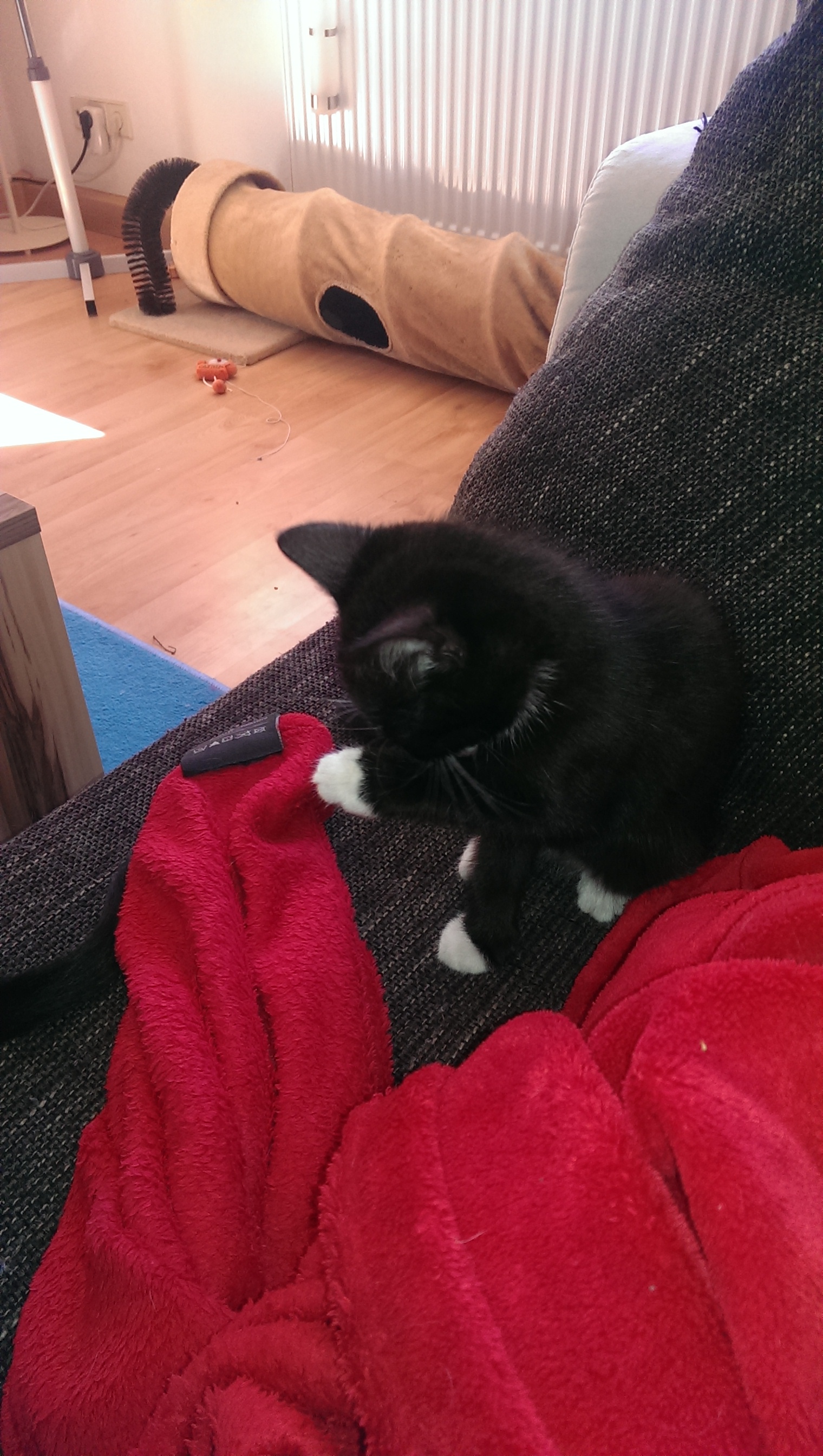 Jedenfalls ist er ein schmusiges, kleines Ding. Und wenn er nicht mit Mama schmust, dann sehr gerne mit dem Jim. Die Beiden kleben ganz fest aneinander. Dann schnurren sie gemeinsam um die Wette und es ist schwer zu sagen wer lauter schnurrt - vermutlich aber Jim.