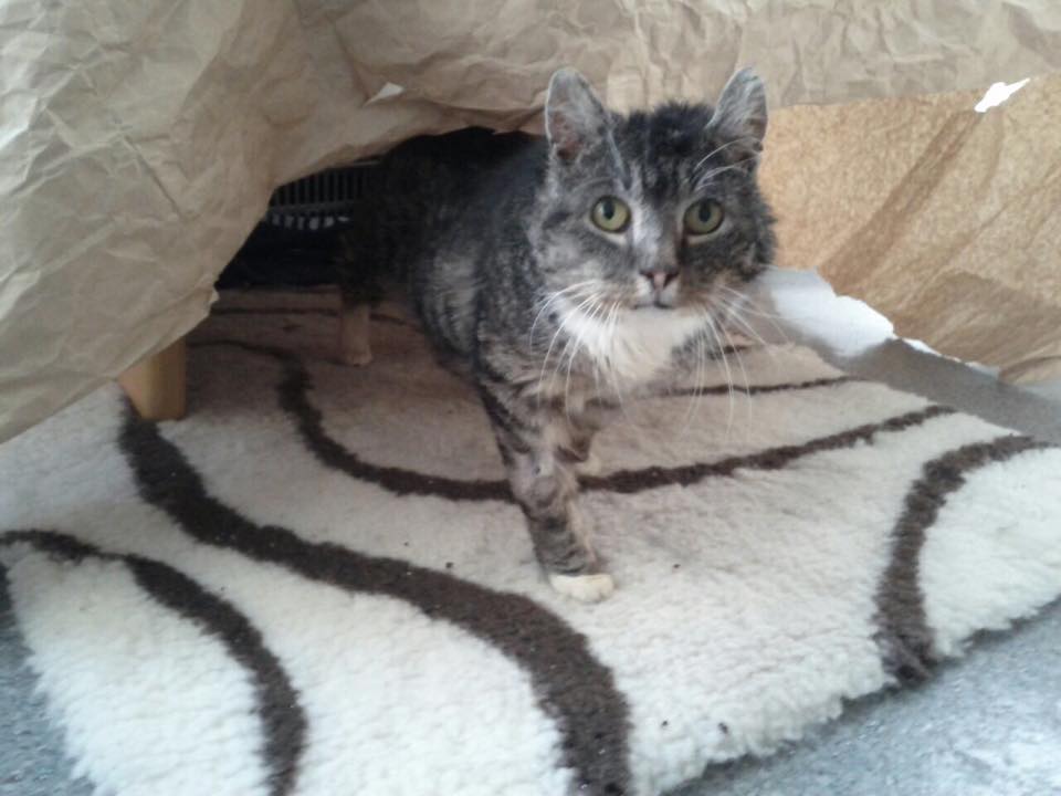 Handzahm ist er noch nicht, aber aktuell ist Henry soweit, dass man auch ganz ohne Lockmittel bis zu einem halben Meter an ihn herankann (natürlich freundlich blinzelnd) und er an die ruhig hingehaltene Hand zum schnuppern kommt. Somit braucht er weiterhin ein ruhiges und geduldiges Zuhause wo er 'seine' Sicherheitszonen (hier z.B. hinter einem schwarzen Vorhang und in der Höhle unter einem Couchtisch) hat und er nicht andauernd eng an Menschen vorbei muss um z.B. an Futter oder Klo zu kommen.