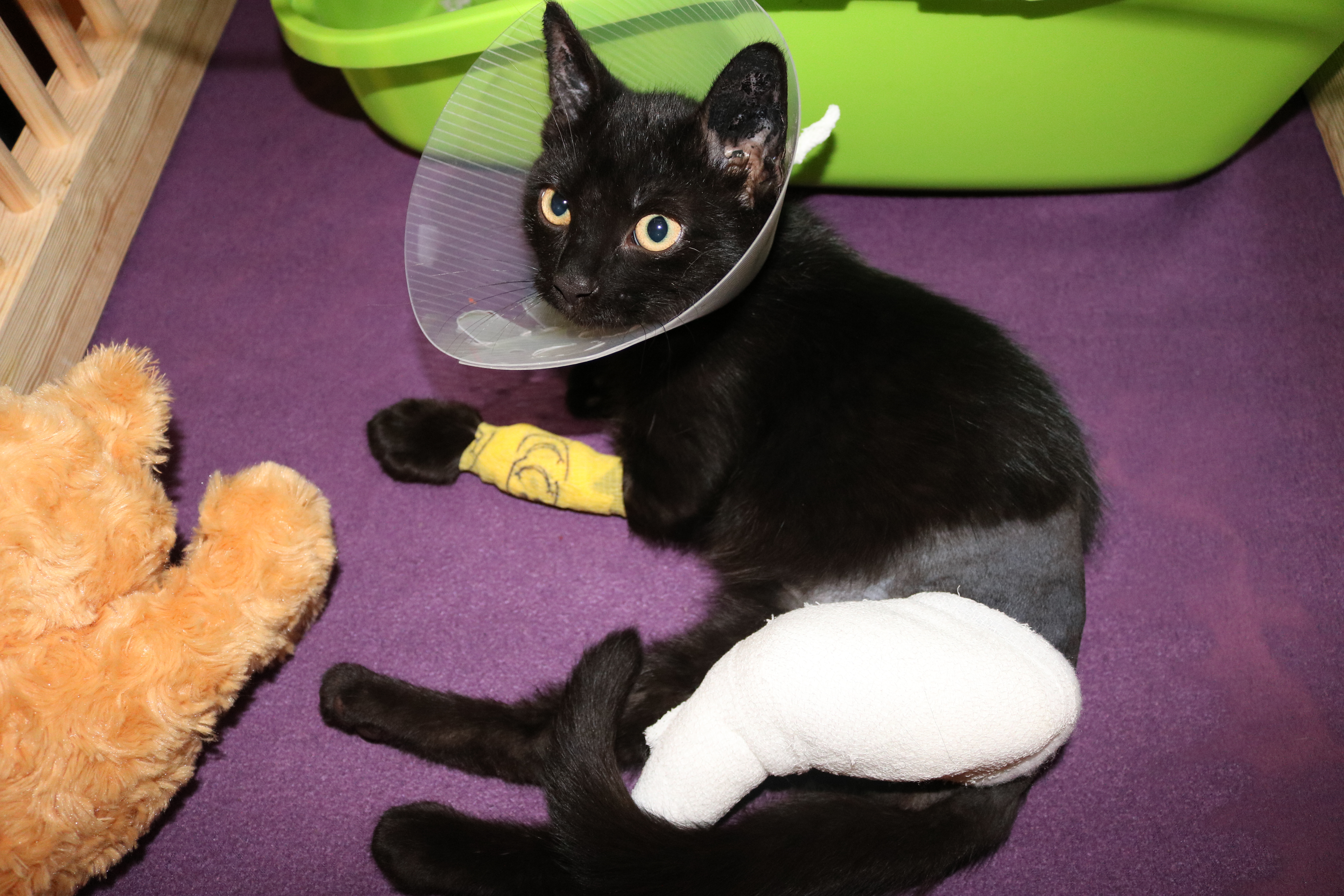 Handicap: Oreo hat nach seiner Femurfraktur (Oberschenkelbruch) Operation bisher keinen Tiefenschmerz mehr in seiner Pfote hinten links und belastet diese deswegen anders bzw. humpelt leicht/tritt mit der ganzen Pfote auf, dies schränkt ihn aber nicht ein.