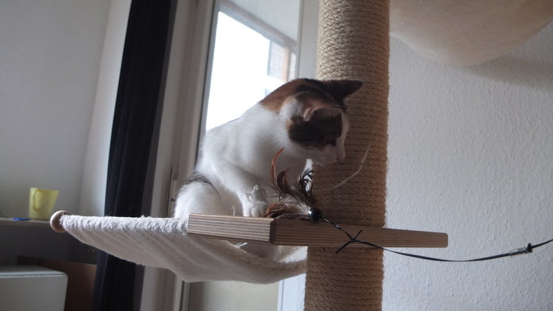 Mit anderen Katzen ist sie eher höflich-freundlich - kurz mal abputzen, Analkontrolle etc. ist gerne auch mit dabei, aber mit Körperkontakt liegen oder ausgiebiges putzen möchte sie nicht. Dafür spielt sie aber liebend gerne und ausgiebig typisch kätzische Fangspiele.