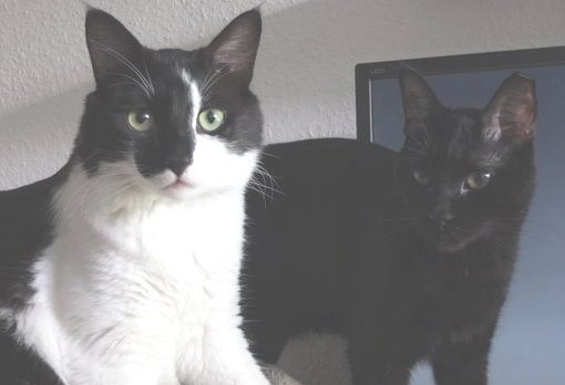 Farbe: Blacky ist schwarz, Sir Patric ist schwarz-weiß und ein Langhaarkater