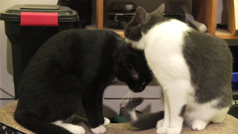 Auch wenn Kater generell gesprochen eher rabiat spielen: Diese beiden werden zusammen vermittelt, da Lino dank Webcambeobachtung tatsächlich nur fangen und ganz selten mal sanftes raufen mit Ivy spielt - und genauso umgekehrt. Das höchste der Gefühle für die beiden ist es, zwischendurch in ein Loch der großen Kratztonne zu huschen und von dort aus Scheinangriffe zu starten. Auch sonst lieben sie sich sehr: Nach fast jeder Mahlzeit wird sich ausgiebig gegenseitig geputzt und oft findet man sie aneinander gekuschelt.