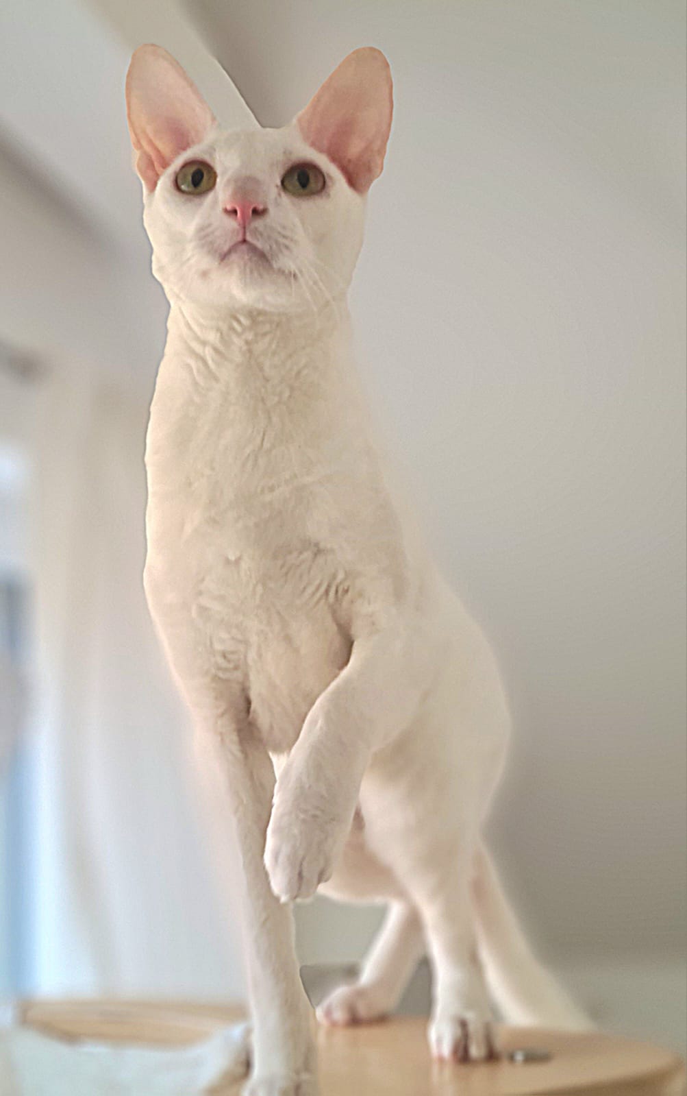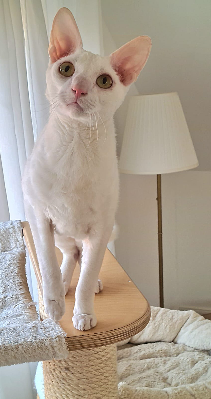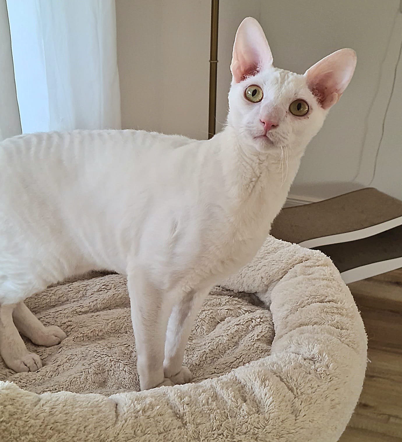 Bic ist ein weißer Cornish Rex Kater von einem Jahr, der leider unverschuldet sein Zuhause verloren hat. Rassetypisch hat er ein unfassbar weiches, welliges Fell. Die Cornish Rex wird auch als Hund im Katzenkörper bezeichnet. So ist auch Bic sehr intelligent und neugierig, gesellig und anhänglich.