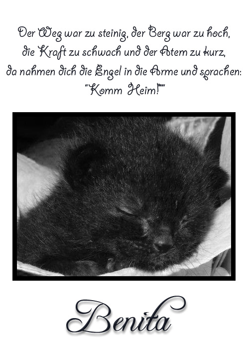 Leider müssen wir euch mitteilen, dass die kleine Benita in der heutigen Nacht stark abgebaut hat. Nachdem ihr Appetit gestern wieder kam, waren wir alle guter Hoffnung. Aber leider wurde der Durchfall so schlimm, dass sie in der Nacht ganze 10 g abgenommen hat. Schweren Herzens haben wir uns heute entschlossen, Benita von ihrem Leid zu erlösen. Sie wurde nur 3 Wochen alt. :-(