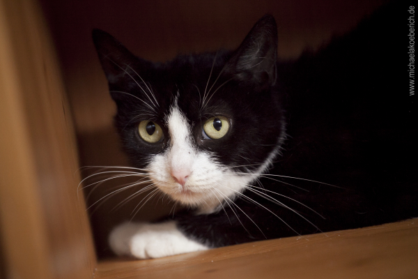 In der Zwischenzeit bin ich nun allein nochmal umgezogen, ich muss mich immernoch etwas mit den menschlichen Gebräuchen vertraut machen, da mir immer noch nicht so alles geheuer ist. Ich mag es aber total gerne, abends in der Nähe meiner Pflegeeltern den Fernsehabend zu beobachten. Außerdem liebe ich es Mäuschen zu kloppen und den Kratzbaum 'rauf und 'runter zu sausen.