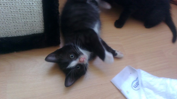 Keine Katze auf der Pflegestelle ist drolliger und witziger als der kleine Jerry. Regelmäßig verknotet er sich die Beine und putzt sich dabei ganz geschickt, oder er macht eine Rolle über seinen Bruder wenn er mit ihm Raufen möchte. Neuestes Highlight: das vertrocknete Palmenblatt. Dieses bespielt er ohne Unterlass und trägt es durch die gesamte Wohnung.