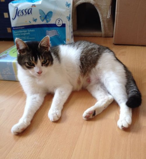 Mama kommt eigentlich von Draußen. Dort hat sie auch schon mal Kitten bekommen, allerdings hat sie die nie mit zu ihrer Futterstelle gebracht. Daher geht meine Menschenmama davon aus, dass die Kleinen es nicht geschafft haben.
