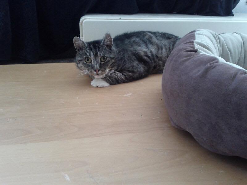 Handzahm ist er noch nicht, aber aktuell ist Henry soweit, dass man auch ganz ohne Lockmittel bis zu einem halben Meter an ihn herankann (natürlich freundlich blinzelnd) und er an die ruhig hingehaltene Hand zum schnuppern kommt. Somit braucht er weiterhin ein ruhiges und geduldiges Zuhause wo er 'seine' Sicherheitszonen (hier z.B. hinter einem schwarzen Vorhang und in der Höhle unter einem Couchtisch) hat und er nicht andauernd eng an Menschen vorbei muss um z.B. an Futter oder Klo zu kommen.