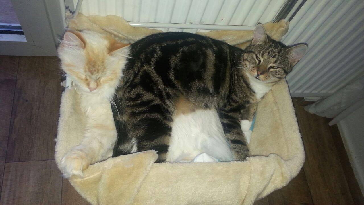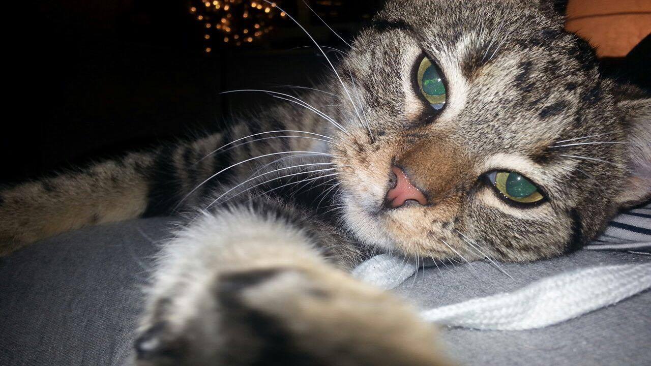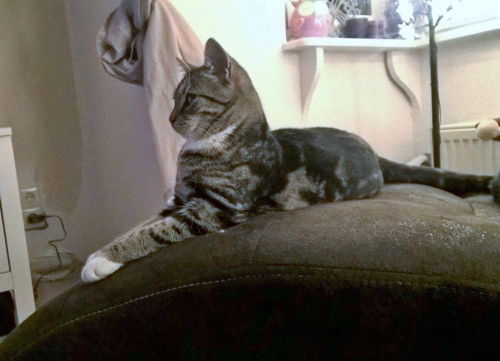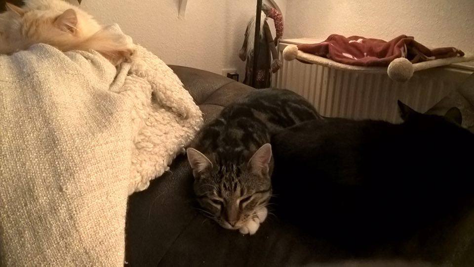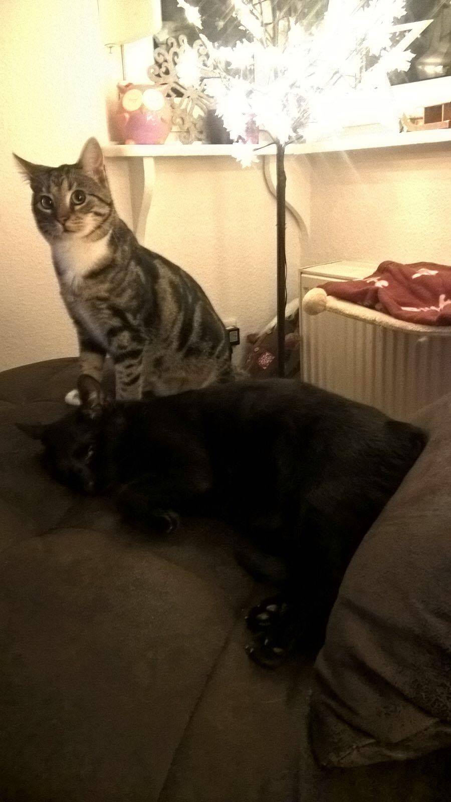 Mittlerweile ließ er sich die Krallen schneiden und liegt genüsslich zwischen uns auf dem auf dem Rücken und lässt sich mit Streicheleinheiten verwöhnen.