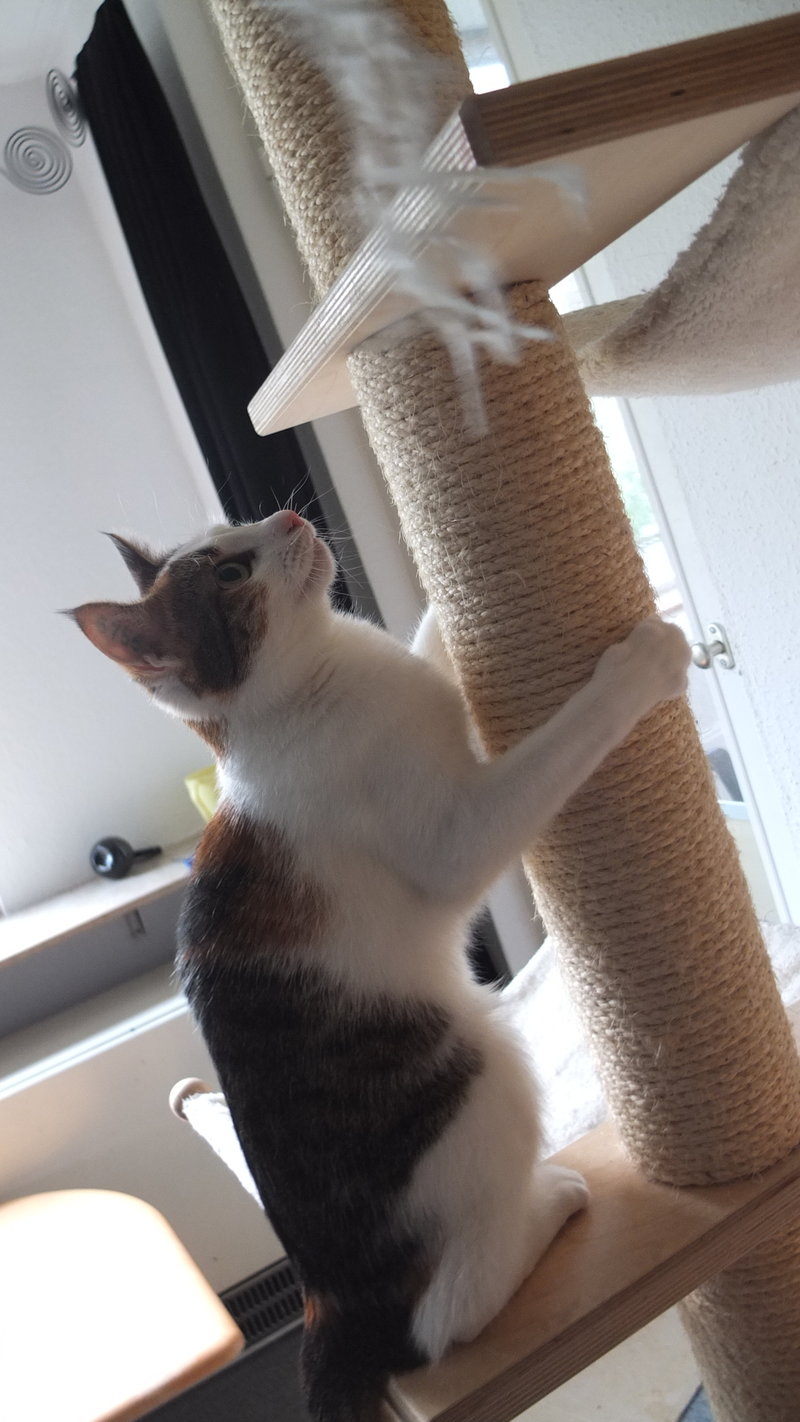 Charakter: Katzentypisch verspielt, aufgeweckt, eher Distanzkatze mit anderen Fellnasen