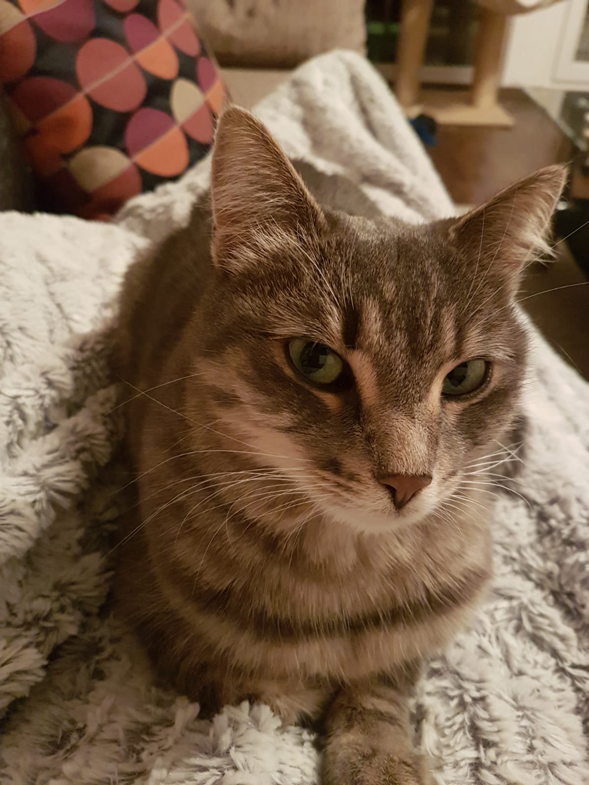 Sie legt gern mal in die Nähe ihres Menschen und lässt sich auch mal ein wenig streicheln, allerdings nur so lange es ihr gefällt. Hochnehmen findet sie nicht so toll.