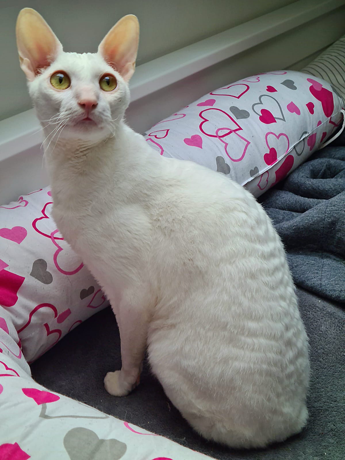Bic ist ein weißer Cornish Rex Kater von einem Jahr, der leider unverschuldet sein Zuhause verloren hat. Rassetypisch hat er ein unfassbar weiches, welliges Fell. Die Cornish Rex wird auch als Hund im Katzenkörper bezeichnet. So ist auch Bic sehr intelligent und neugierig, gesellig und anhänglich.