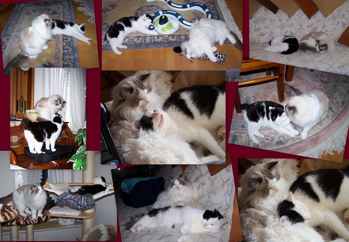 Dort trifft sie auf Biggie und Jannis. Die Zusammenführung war nach kurzem Beschnuppern abgeschlossen. Wenige Tage später gaben Biggie und Jeannie bekannt, dass sie sich ineinander verliebt hatten und waren fortan unzertrennlich. Sie verstehen sich auch heute noch gut, es sind zwei Jahre vergangen. Jeannie hat sich an Biggies längeres Ragdollfell gewöhnt und hilft ihm desöfteren bei der Fellpflege. Eine Kuschelsymbiose hat sie jedoch seit über einem Jahr mit Jannis. Sie nimmt den Ori mit seinen Eigenarten so, wie er ist. Eine Spielfreundschaft pflegt sie zu den später dazugekommenen Ladys Mia und Tinka. Vielleicht kennen sie sich noch von früher aus ihrer gemeinsamen Hofzeit?
