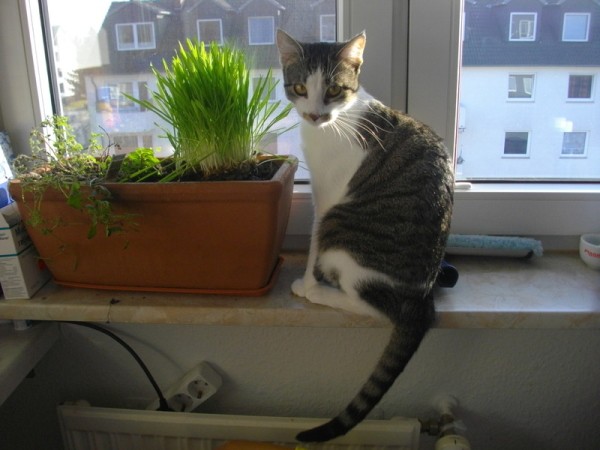 Ich kanns kaum fassen, das Merle und Linus schon fast ein Jahr hier sind. Sie sind so schnell groß geworden und nun im besten Flegelalter. Haben nur Flausen und Blödsinn im Kopf. Katy ist dank der Beiden richtig aufgeblüht. Sie spielt und tobt mit Linus und Merle durch die Wohnung und oft liegen zwei oder alle drei von ihnen gemeinsam auf ihrem Sessel und Schlafen eng aneinander geschmiegt. Ich lieb die Drei so sehr und kann mir ein Leben ohne sie nicht mehr vorstellen. Gerade jetzt liegt Linus neben mir auf dem Sofa und schaut, ob ich auch ja das Richtige schreibe.