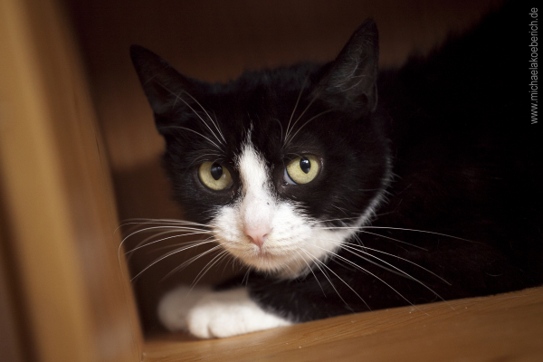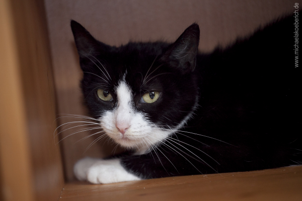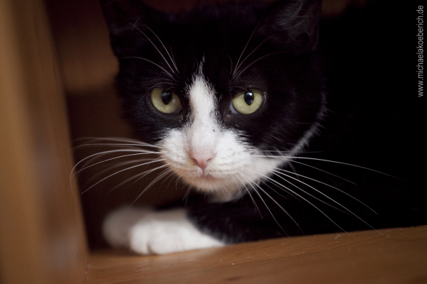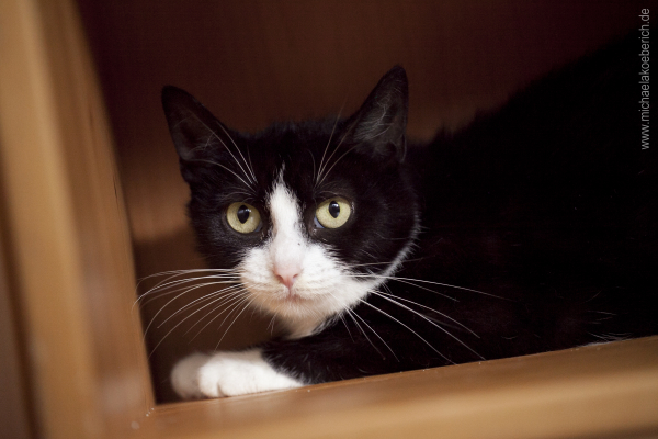 In der Zwischenzeit bin ich nun allein nochmal umgezogen, ich muss mich immernoch etwas mit den menschlichen Gebräuchen vertraut machen, da mir immer noch nicht so alles geheuer ist. Ich mag es aber total gerne, abends in der Nähe meiner Pflegeeltern den Fernsehabend zu beobachten. Außerdem liebe ich es Mäuschen zu kloppen und den Kratzbaum 'rauf und 'runter zu sausen.