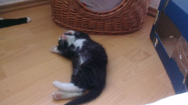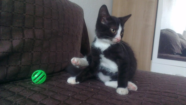 Keine Katze auf der Pflegestelle ist drolliger und witziger als der kleine Jerry. Regelmäßig verknotet er sich die Beine und putzt sich dabei ganz geschickt, oder er macht eine Rolle über seinen Bruder wenn er mit ihm Raufen möchte. Neuestes Highlight: das vertrocknete Palmenblatt. Dieses bespielt er ohne Unterlass und trägt es durch die gesamte Wohnung.