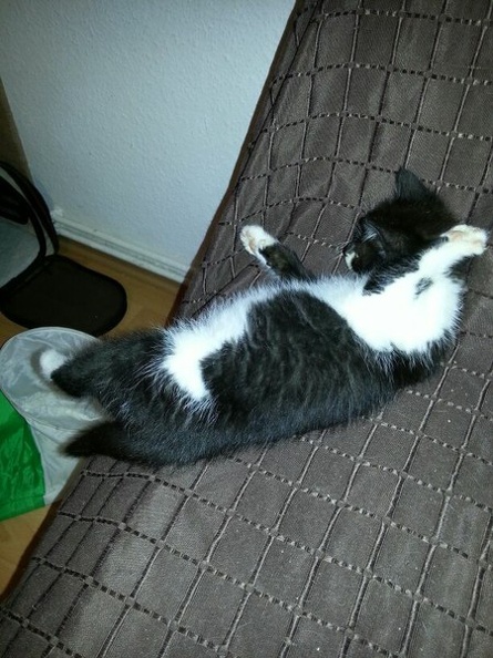 Sie ist sehr verfressen, wie sich das für Kitten gehört und schmust und spielt auch gerne mit Amelie. Wenn man sie nur mit der Fingerspitze berührt, ist das kleine Fellknäul schon am schnurren.