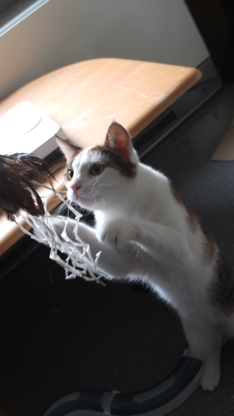 Mit anderen Katzen ist sie eher höflich-freundlich - kurz mal abputzen, Analkontrolle etc. ist gerne auch mit dabei, aber mit Körperkontakt liegen oder ausgiebiges putzen möchte sie nicht. Dafür spielt sie aber liebend gerne und ausgiebig typisch kätzische Fangspiele.