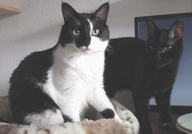 Farbe: Blacky ist schwarz, Sir Patric ist schwarz-weiß und ein Langhaarkater