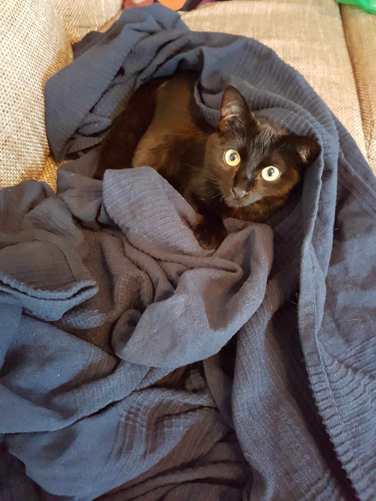 Fremden Menschen gegenüber ist sie anfangs misstrauisch, hat sie jedoch Vertrauen gefasst, kommt sie gern mal zum Streicheln und legt sich zum Kuscheln zu einem ins Bett oder aufs Sofa.
