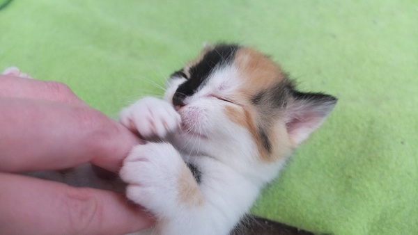 Malaika war die erste im Bunde. Sobald sie sehen, hören und laufen konnte zeigte sie sich stets ein kleines Quentchen interessierter am Menschen, kam schon früh zum Rand des Laufstalls gewackelt wann immer sie wach war und sich die Pflegetante zeigte. Mit 3 kraftvollen Brüdern hat die Maus einiges zu tun und zeigt bereits jetzt sehr schnell durch Protestquietschen mit jedem ihrer Brüder, dass ihr das zu viel und zu grob ist. Da kam der Mensch ihr teilweise gerade recht und mit 4 Wochen schon kuschelte sie sich schnurrend bei Mensch ein. Nun aktuell hat sie - wie ihre Geschwister auch - natürlich meist viel aufregenderes im Sinn als zu liegen und kuscheln ;-)