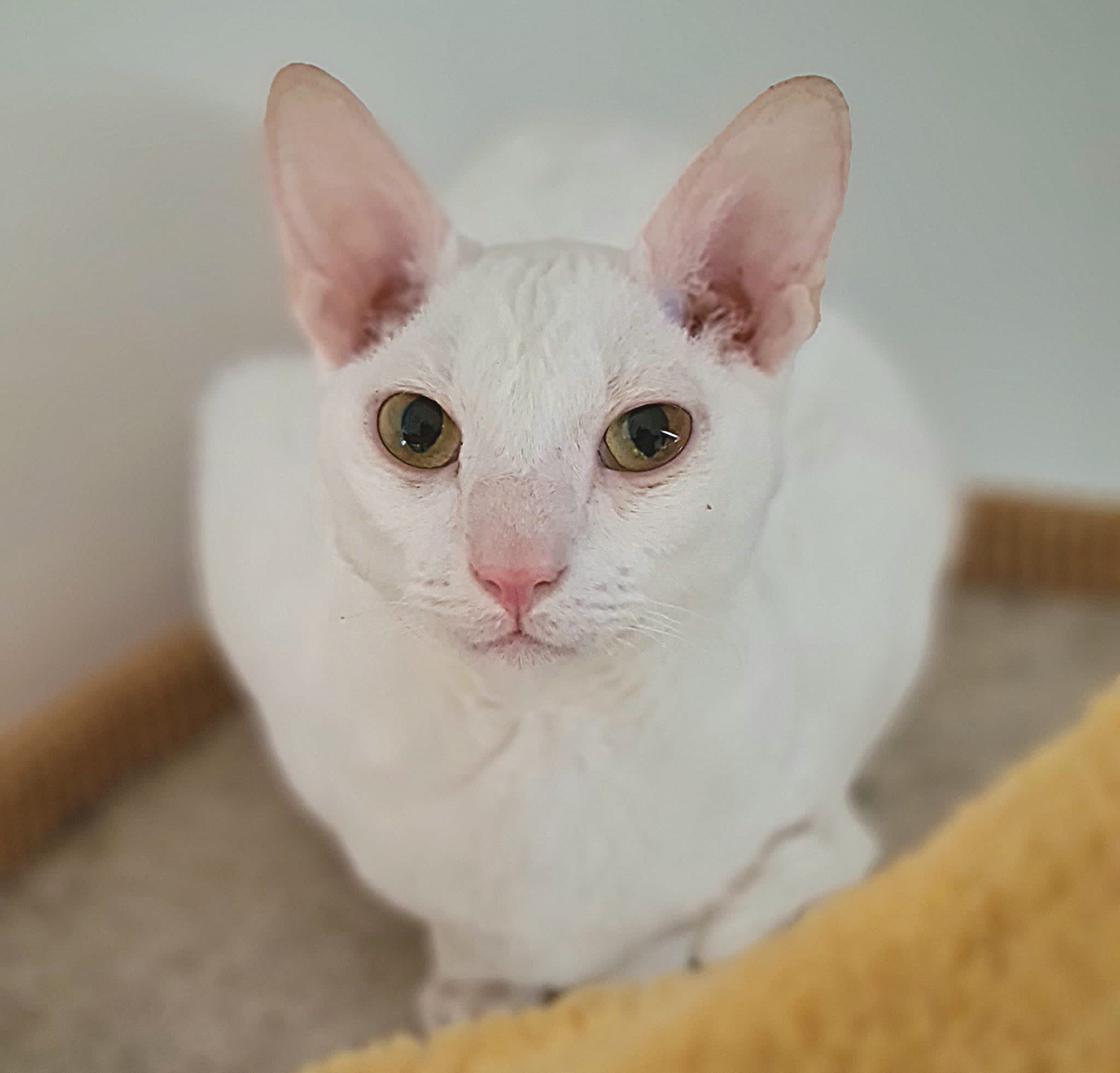 Bic ist ein weißer Cornish Rex Kater von einem Jahr, der leider unverschuldet sein Zuhause verloren hat. Rassetypisch hat er ein unfassbar weiches, welliges Fell. Die Cornish Rex wird auch als Hund im Katzenkörper bezeichnet. So ist auch Bic sehr intelligent und neugierig, gesellig und anhänglich.