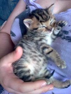 Am 31.05.2012 bekamen Mel und Holger einen Anruf. Eine Frau hätte ein kleines Kitten gefunden und sie würde es sofort vorbei bringen. Die Dame brachte ein kleines Kätzchen (von der Tierärztin auf vielleicht 2-2,5 Wochen geschätzt), dass maunzte und Hilfe brauchte. Da konnten sie natürlich nicht nein sagen.